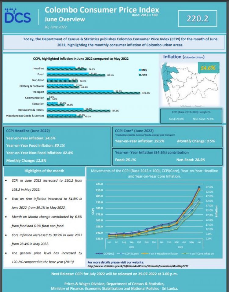 இலங்கையின் பணவீக்கம் 2022 ஜூன் மாதத்தில் 54.6 வீதமாக உயர்ந்துள்ளதாக தெரிவிக்கப்பட்டுள்ளது.
