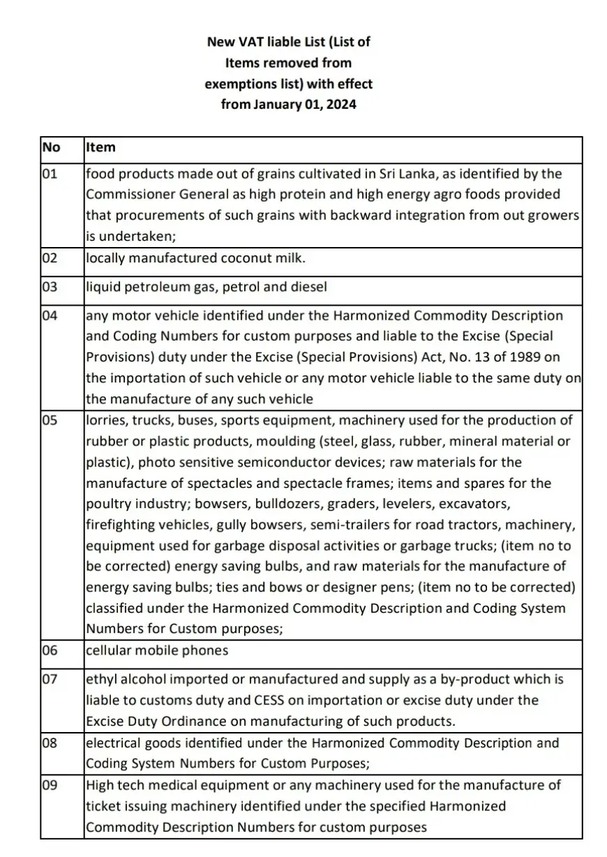 2024 ஜனவரி 1 ஆம் திகதி முதல் இதுவரை வரி விலக்கு அளிக்கப்பட்டிருந்த பல பொருட்களுக்கு வற் விதிக்கப்படவுள்ளது.