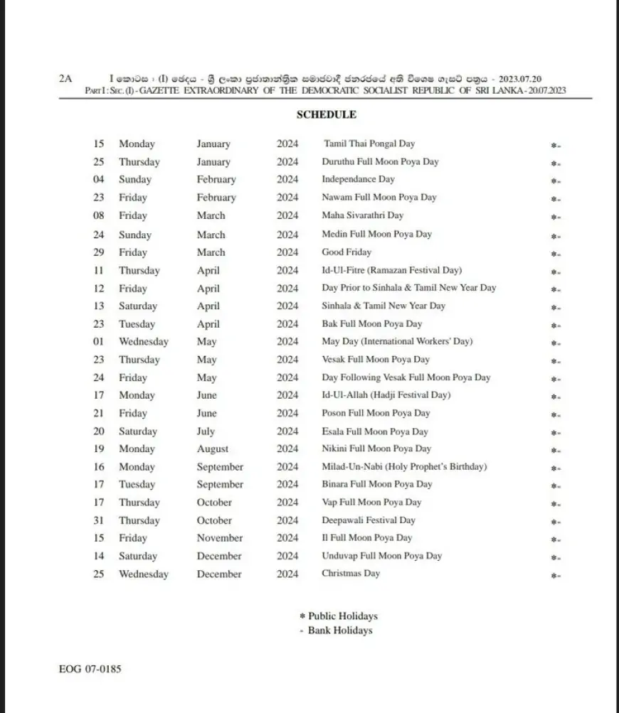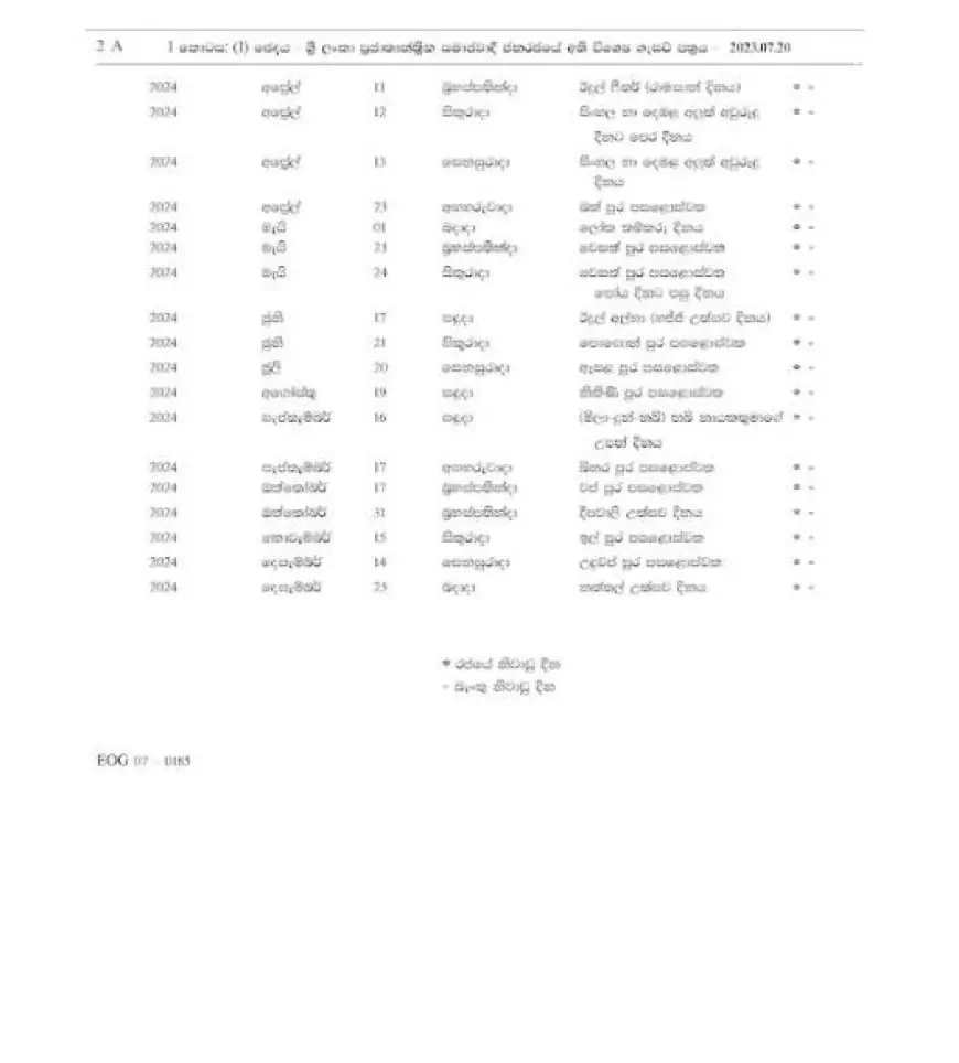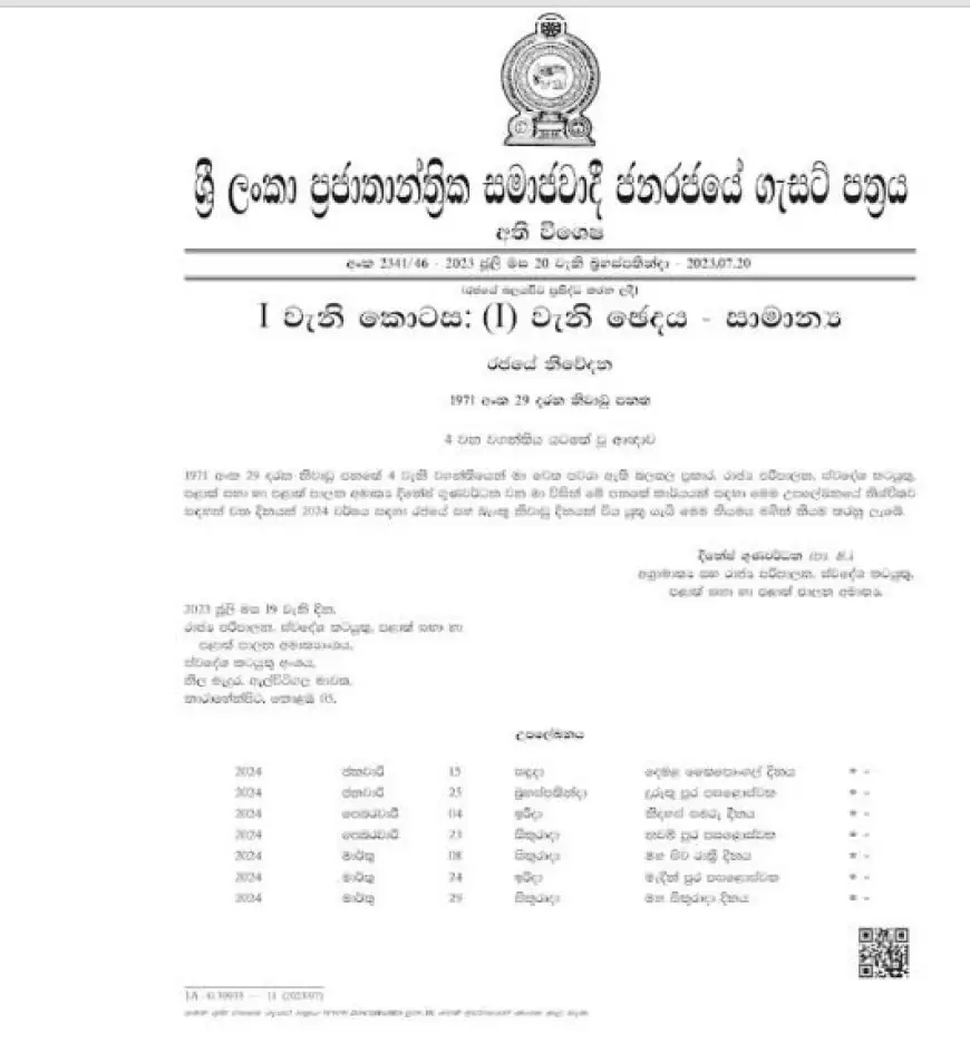 இதன்படி, 2024 ஆம் ஆண்டுக்கான 25 விடுமுறை நாட்களை உள்ளடக்கி அறிவித்தல் வெளியிடப்பட்டுள்ளது.