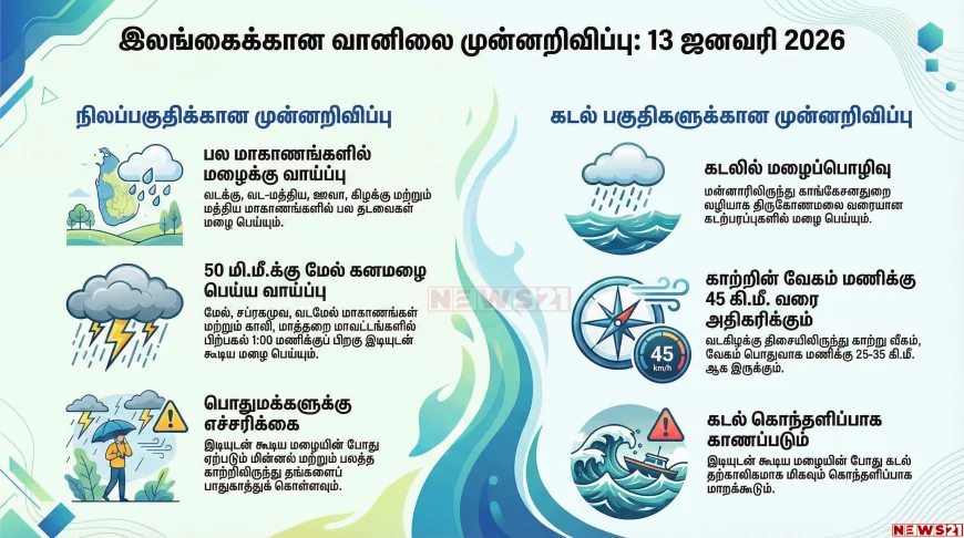 வடக்கு, வட-மத்திய, ஊவா, கிழக்கு மற்றும் மத்திய மாகாணங்களில் பல தடவைகள் மழை பெய்யக்கூடும் என வளிமண்டலவியல் திணைக்களம் தெரிவித்துள்ளது. அதேவேளை, மேல், சப்ரகமுவ மற்றும் வடமேல் மாகாணங்களிலும், காலி மற்றும் மாத்தறை மாவட்டங்களிலும் பிற்பகல் 01 மணிக்குப் பின்னர் சில இடங்களில் மழையோ அல்லது இடியுடன் கூடிய மழையோ பெய்ய வாய்ப்பு உள்ளதாக வானிலை முன்னறிவிப்பில் குறிப்பிடப்பட்டுள்ளது.