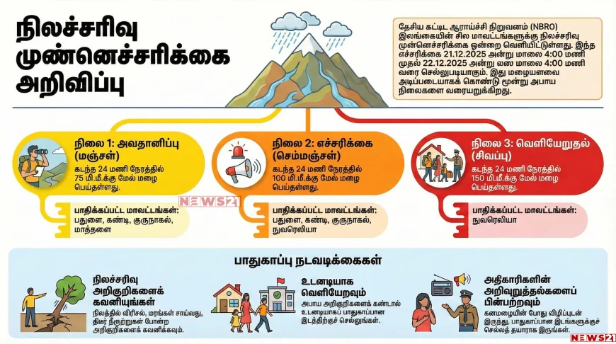 கடந்த சில நாட்களாக பெய்த மழை, வடகிழக்கு பருவப்பெயர்ச்சி மற்றும் எதிர்வரும் நாட்களில் பெய்யக்கூடிய மழையை கருத்தில் கொண்டு, தேசிய கட்டிட ஆராய்ச்சி நிறுவனம் வெளியிட்ட மண்சரிவு அபாய முன்னறிவிப்பு எச்சரிக்கை மேலும் நீடிக்கப்பட்டுள்ளதாக அறிவிக்கப்பட்டுள்ளது.