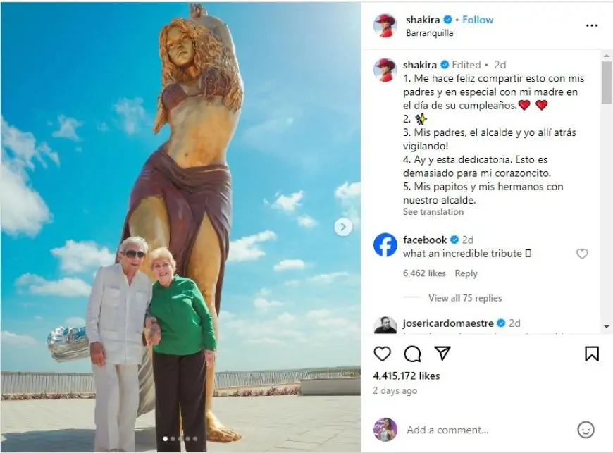 ஷகிரா, சிலைக்கு முன் தமது பெற்றோர் நிற்கும் படங்களை அவரது Instagram பக்கத்தில் பகிர்ந்துகொண்டார்.