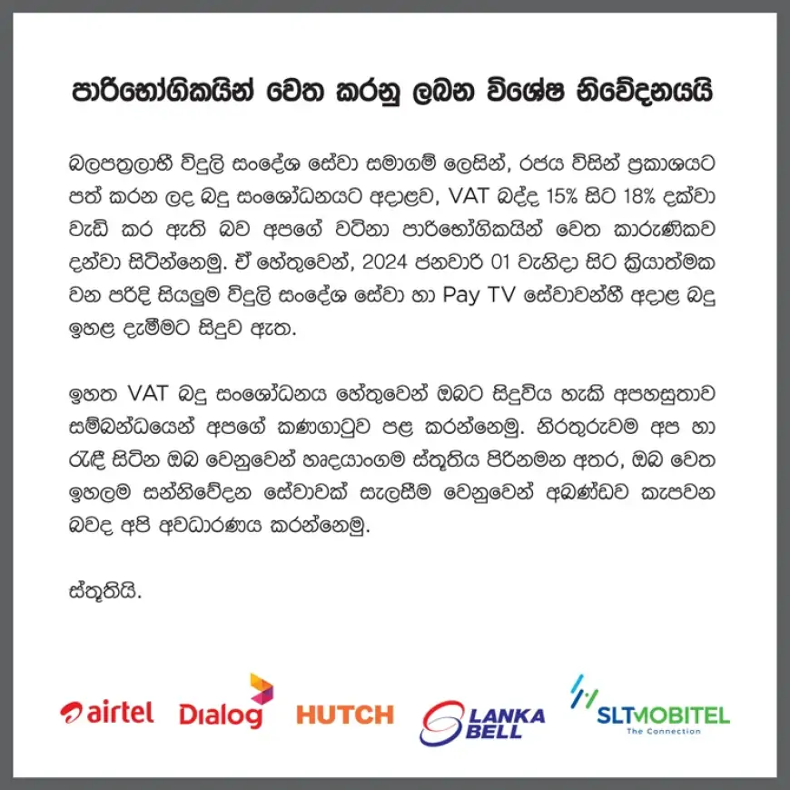 நாட்டில் இயங்கி வரும் அனைத்து தொலைத்தொடர்பு சேவை வழங்குநர்களும் இணைந்து ஒரு அறிவிப்பை வெளியிட்டுள்ளனர்.