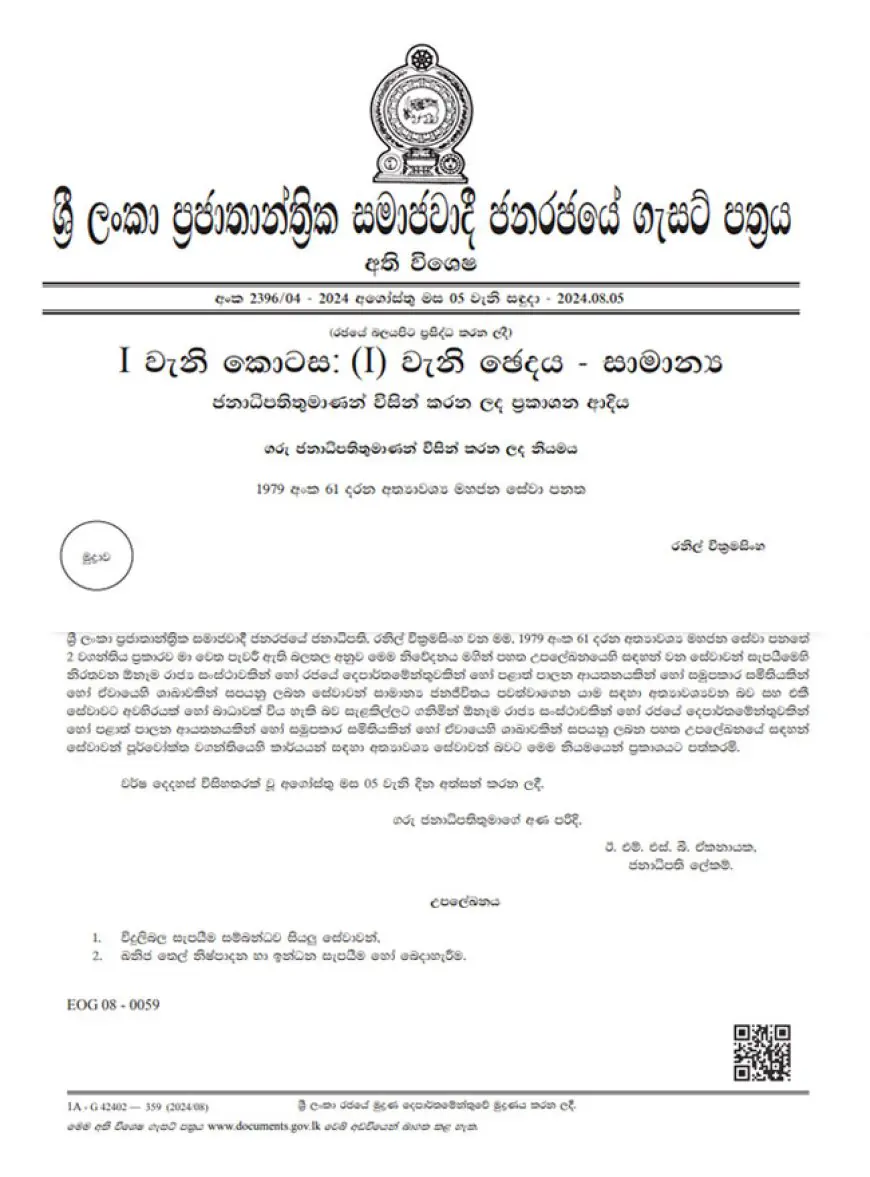 ஜனாதிபதி ரணில் விக்கிரமசிங்கவின் பணிப்புரையின் பேரில், ஜனாதிபதி செயலாளர் சமன் ஏக்கநாயக்க நேற்று (05) வர்த்தமானி அறிவித்தலை வெளியிட்டதாக தெரிவிக்கப்படுகிறது.
