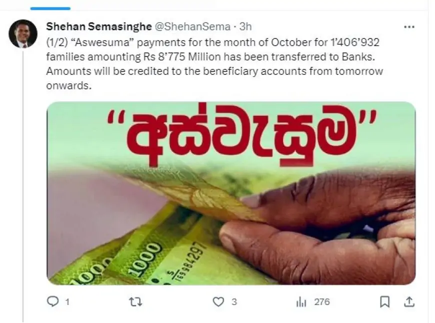 அஸ்வெசும சமூக நலன்புரி திட்டத்தின் கீழ், ஒக்டோபர் மாதத்திற்கான கொடுப்பனவுகள், நாளை (05) முதல் பயனாளிகளின் வங்கிக் கணக்குகளில் வைப்பிலிடப்படும் என என நிதி இராஜாங்க அமைச்சர் செஹான் சேமசிங்க தெரிவித்தார்.
