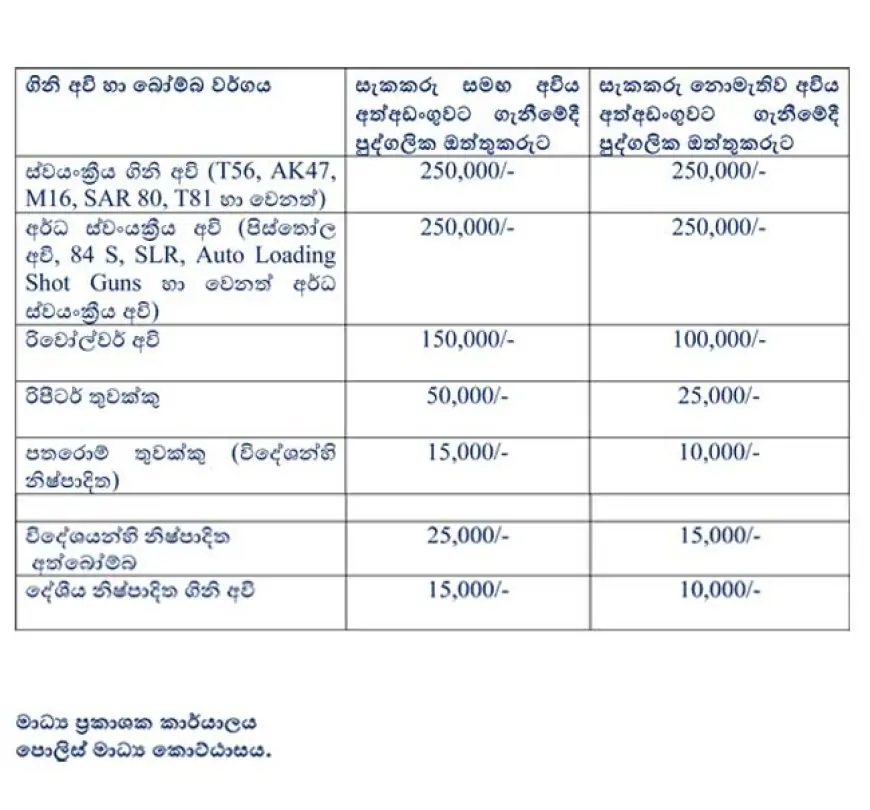 அதன்படி, சட்டவிரோத T56, AK47, M16, SAR80, T81, 84S மற்றும் SLR போன்ற தானியங்கி துப்பாக்கிகள் பற்றிய முக்கிய தகவல்களை வழங்குபவர்களுக்கு 250,000 ரூபாய் வழங்கப்படவுள்ளது.