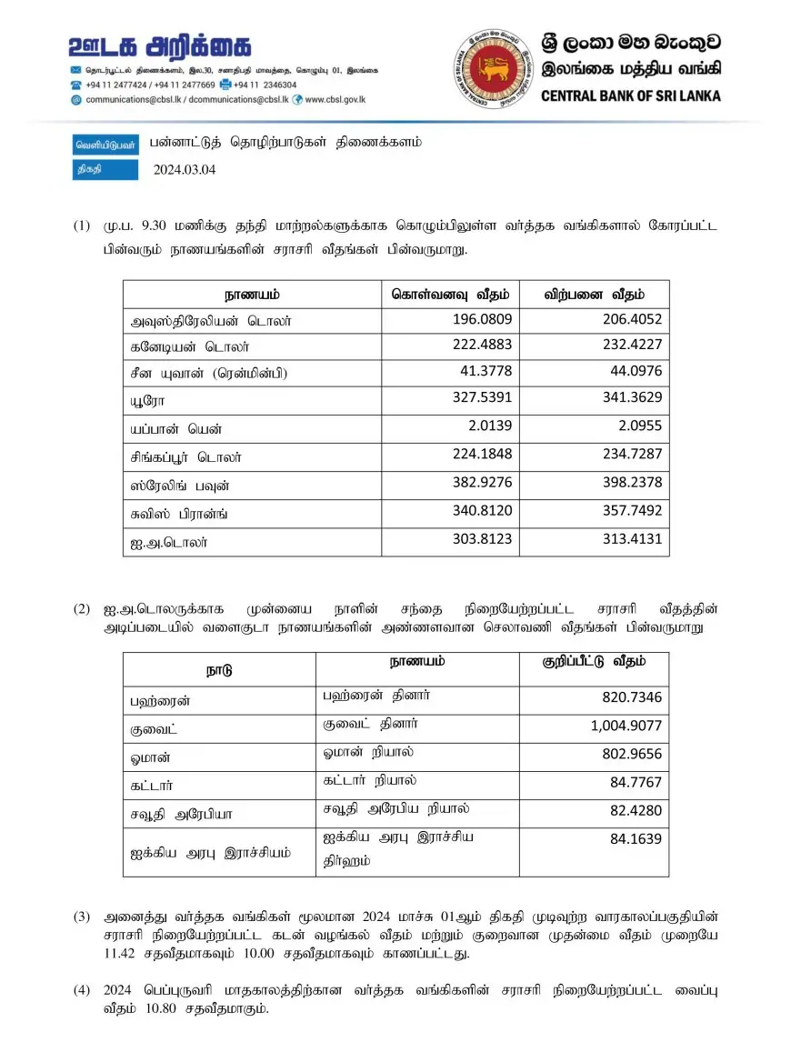 இலங்கை மத்திய வங்கி வெளியிட்டுள்ள நாணயமாற்று விகிதத்தின் படி அமெரிக்க டொலர் ஒன்றின் கொள்முதல் பெறுமதி 303.81 ரூபாயாகவும், விற்பனை வீதம் 313.41 ரூபாயாகவும் பதிவாகியுள்ளது.