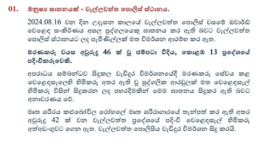 வெள்ளவத்தை பொலிஸ் பிரிவுக்குட்பட்ட பகுதியில் நேற்று வெள்ளிக்கிழமை (16) காலை ஒருவர் படுகொலை செய்யப்பட்ட சம்பவம் தொடர்பில் வெள்ளவத்தை பொலிஸார் விசாரணைகளை ஆரம்பித்துள்ளனர்.