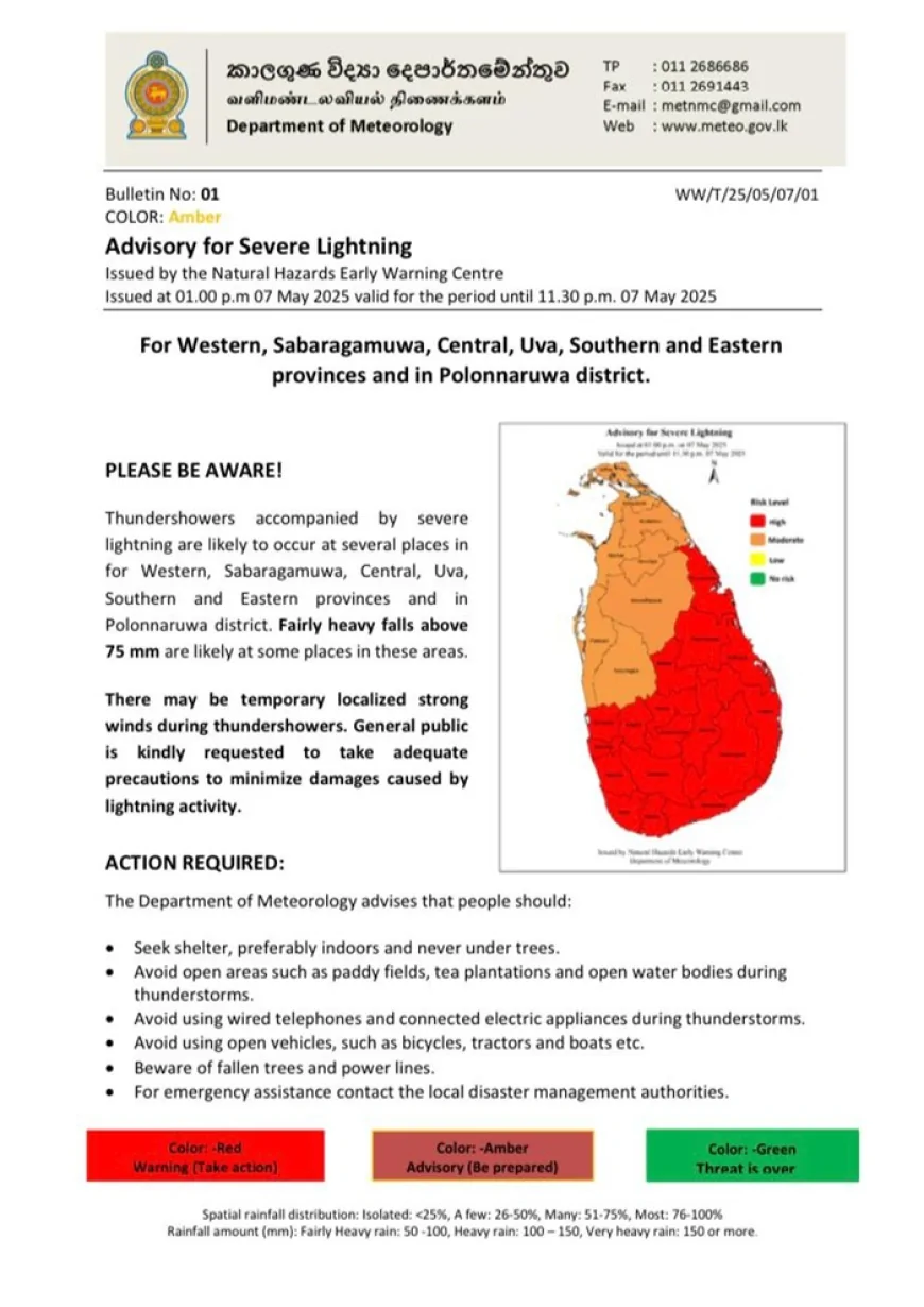 The Department of Meteorology has issued an advisory for severe lightning in the Western, Sabaragamuwa, Central, Uva, Southern and Eastern provinces and the Polonnaruwa district.