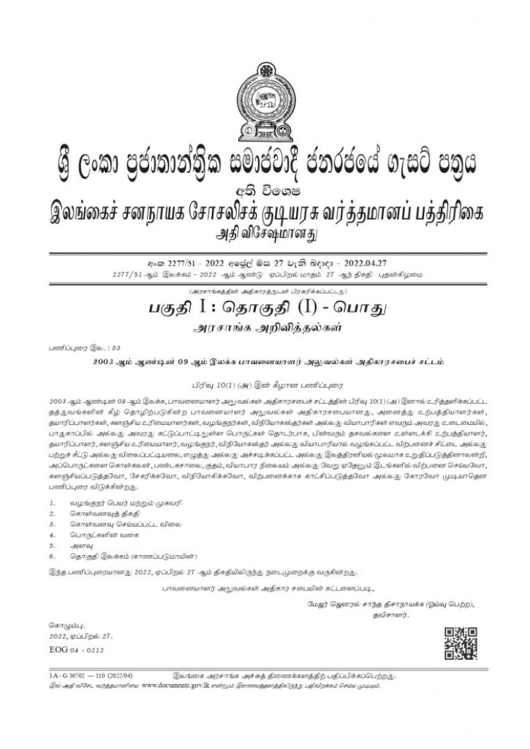 அந்தத் தகவல்கள் அடங்காத பொருட்களை விற்கவோ, சேமித்து வைக்கவோ, விநியோகிக்கவோ, விற்பனைக்கு வழங்கவோ அல்லது விற்பனைக்குக் காட்சிப்படுத்தவோ கூடாது என்று நுகர்வோர் விவகார அதிகார சபை வௌியிட்டுள்ள வர்த்தமானி அறிவித்தலூடாக தெரிவித்துள்ளது.