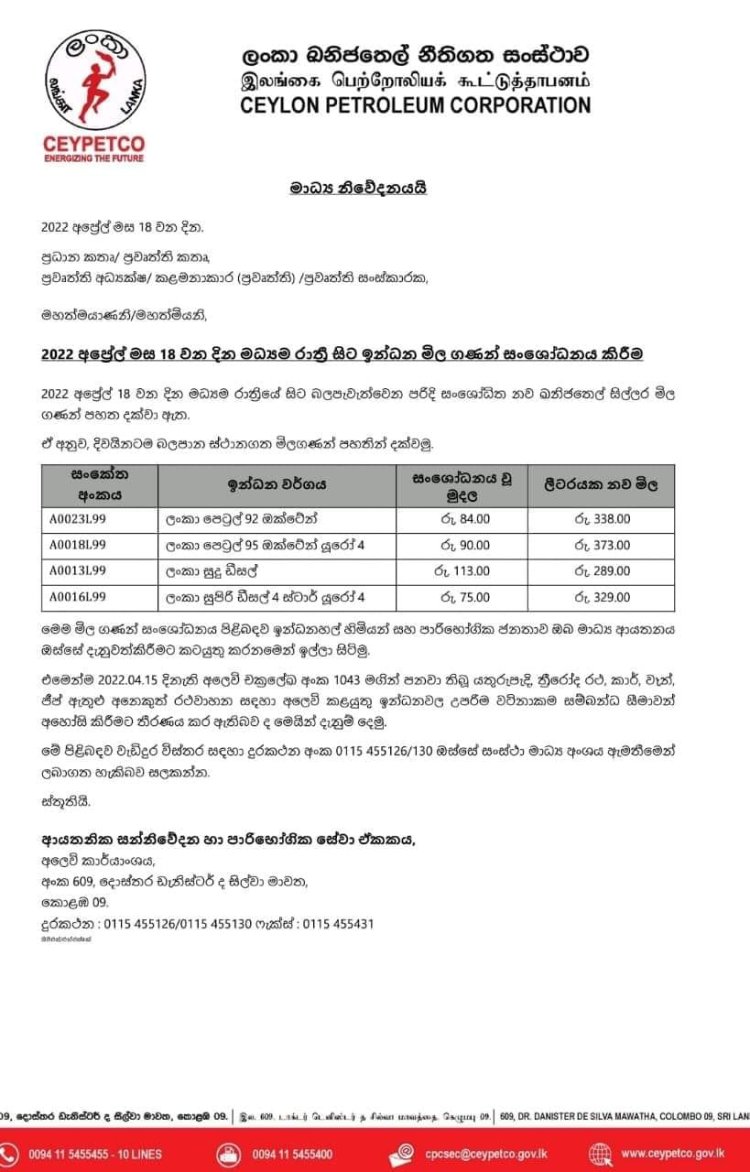 இதன்படி, ஒக்டேன் (92) பெட்ரோல் லிட்டர் 338 ரூபாயாகவும், ஒக்டேன் (95) லிட்டருக்கு 373 ரூபாயாகவும், ஒட்டோ டீசல் லிட்டர் 289 ரூபாயாகவும், சூப்பர் டீசல் லிட்டர் 329 ரூபாயாகவும் உயர்த்தப்பட்டுள்ளது.