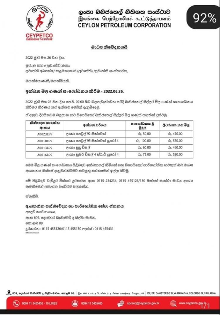 92 ஒக்டேன் பெட்ரோல் 50 ரூபாயினால் விலை அதிகரிக்கப்பட்டு புதிய விலை 470 ரூபாயாகும்.