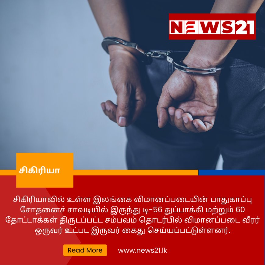 சிகிரியாவில் உள்ள இலங்கை விமானப்படையின் பாதுகாப்பு சோதனைச் சாவடியில் இருந்து டி-56 துப்பாக்கி மற்றும் 60 தோட்டாக்கள் திருடப்பட்ட சம்பவம் தொடர்பில் விமானப்படை வீரர் ஒருவர் உட்பட இருவர் கைது செய்யப்பட்டுள்ளனர்.