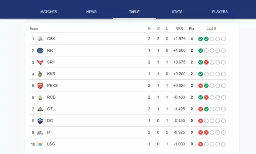 இந்த தொடரில் இதுவரை 8 லீக் ஆட்டங்கள் முடிவடைந்துள்ள நிலையில், அதில் 2 ஆட்டங்களில் விளையாடி இரண்டிலும் வெற்றி பெற்றுள்ள நடப்பு சாம்பியன் சென்னை சூப்பர் கிங்ஸ் முதலிடத்தில் உள்ளது.