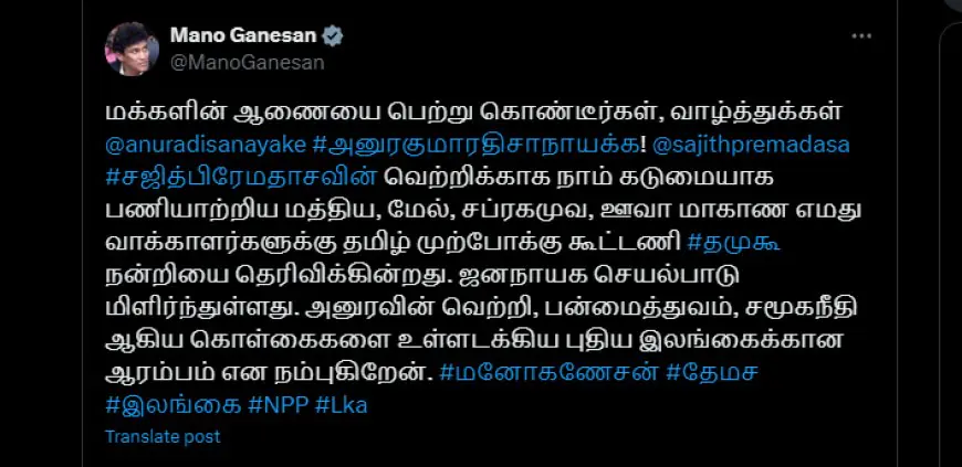 ஜனாதிபதித் தேர்தலில் அதிகப்படியான வாக்குகளைப் பெற்று முன்னணியில் உள்ள தேசிய மக்கள் சக்தியின் தலைவர் அநுரகுமார திஸாநாயக்கவுக்கு, தமிழ் முற்போக்குக் கூட்டணியின் தலைவர் மனோ கணேசன், தனது x தளத்தில் வாழ்த்துத் தெரிவித்துள்ளார்.