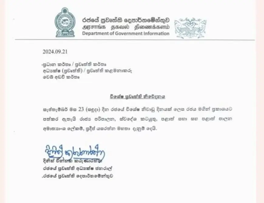 நாளை மறுதினம் திங்கட்கிழமை (23) விசேட அரச விடுமுறையாக அறிவிக்கப்பட்டுள்ளது.
