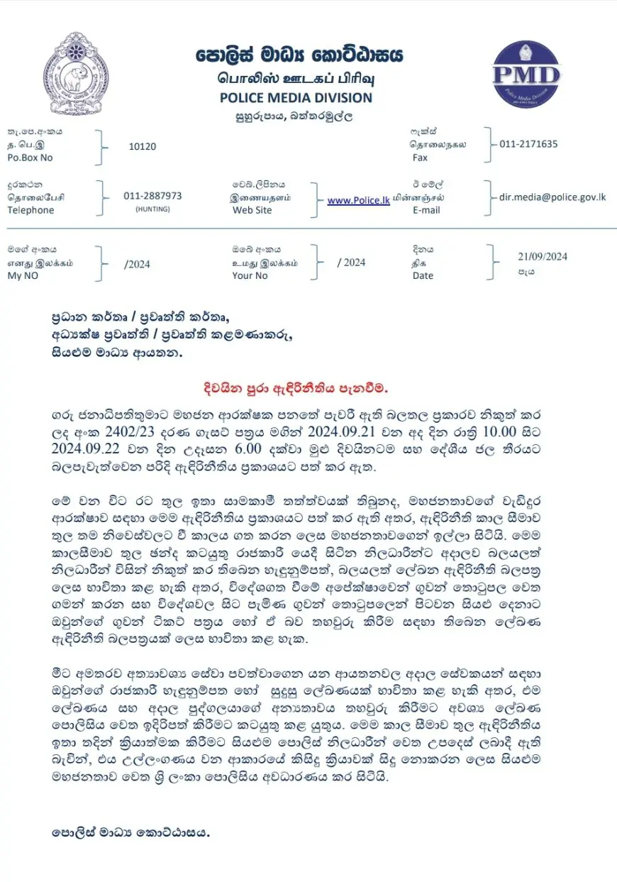 இதற்கு மேலதிகமாக, அத்தியாவசிய சேவைகளை நடத்தும் நிறுவனங்களின் தொடர்புடைய ஊழியர்களுக்கு, அவர்களின் உத்தியோகபூர்வ அடையாள அட்டை அல்லது பொருத்தமான ஆவணம் பயன்படுத்த முடியும். மேலும் அந்த ஆவணம் மற்றும் தொடர்புடைய நபரின் அடையாளத்தை உறுதிப்படுத்த தேவையான ஆவணங்களை பொலிஸாரிடம் சமர்ப்பிக்க நடவடிக்கை எடுக்க வேண்டும்.