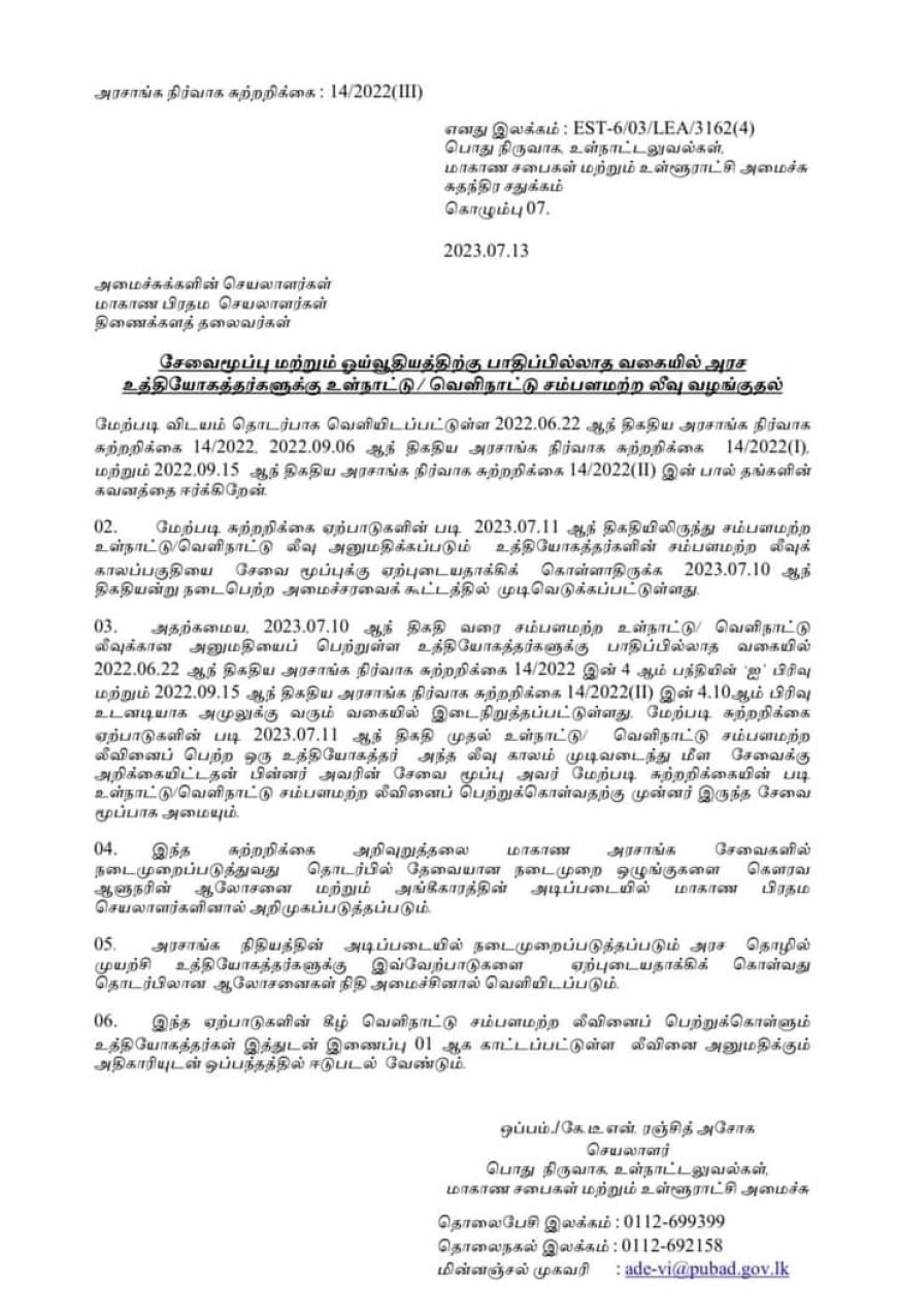 சம்பளம் இன்றி அரச ஊழியர்களுக்கு விடுமுறை வழங்கும் முறைமை குறித்து சுற்றறிக்கை வெளியாகியுள்ளது.