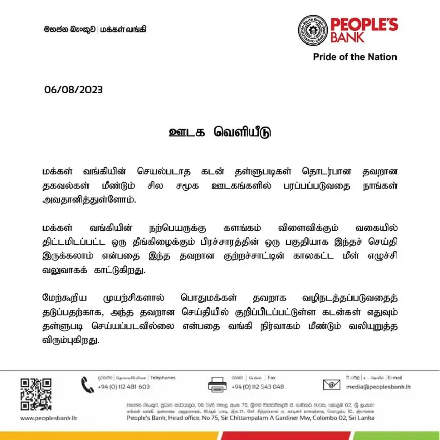மக்கள் வங்கியின் செயல்படாத கடன் தள்ளுபடிகள் தொடர்பான தவறான தகவல்கள் சில சமூக ஊடகங்களில் பரப்பப்படுவதாக மக்கள் வங்கி அறிவித்துள்ளது.