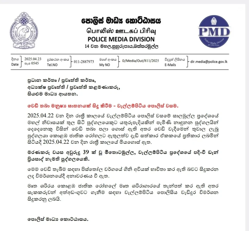 வெல்லம்பிட்டிய லக்ஸந்த செவன அடுக்குமாடி குடியிருப்பின் மேல் மாடியில் நேற்று (22) இரவு 9.10 மணியளவில் துப்பாக்கிச் சூடு இடம்பெற்றதாக பொலிஸ் ஊடகப் பேச்சாளர் தெரிவித்தார்.