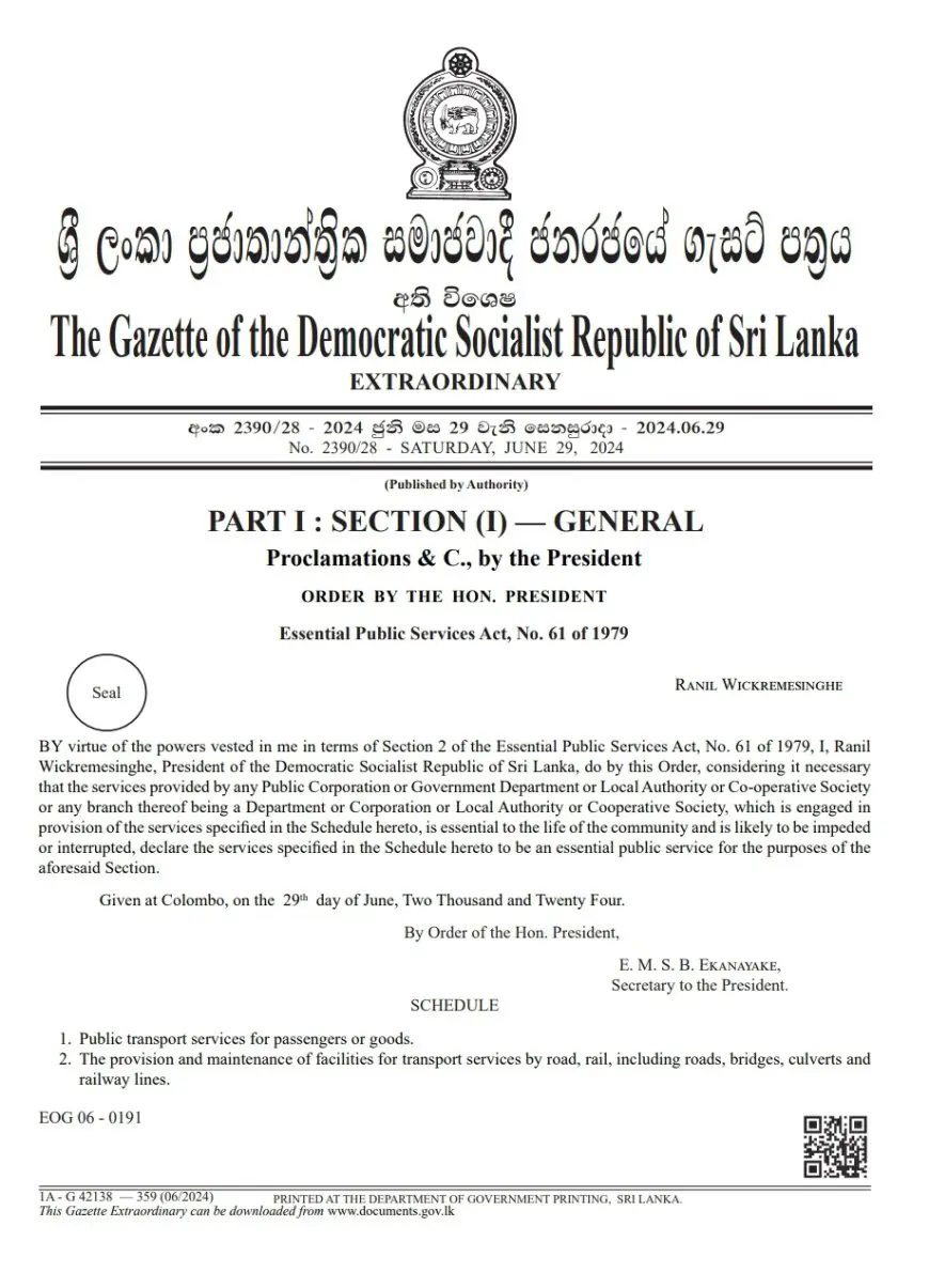 பொது போக்குவரத்தை அத்தியாவசிய சேவையாக பிரகடனப்படுத்தி ஜனாதிபதி ரணில் விக்கிரமசிங்க அதிவிசேட வர்த்தமானி அறிவித்தலை வெளியிட்டுள்ளார்.