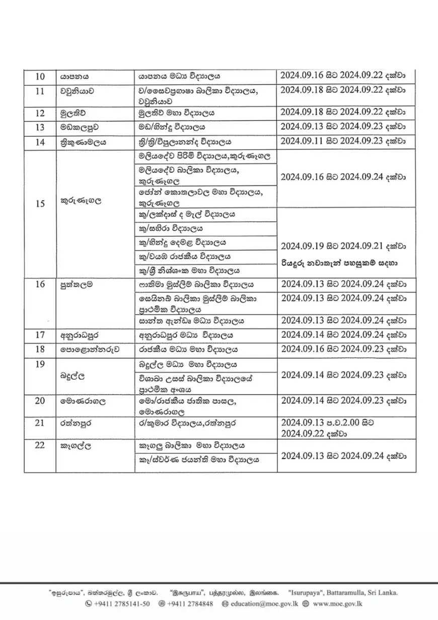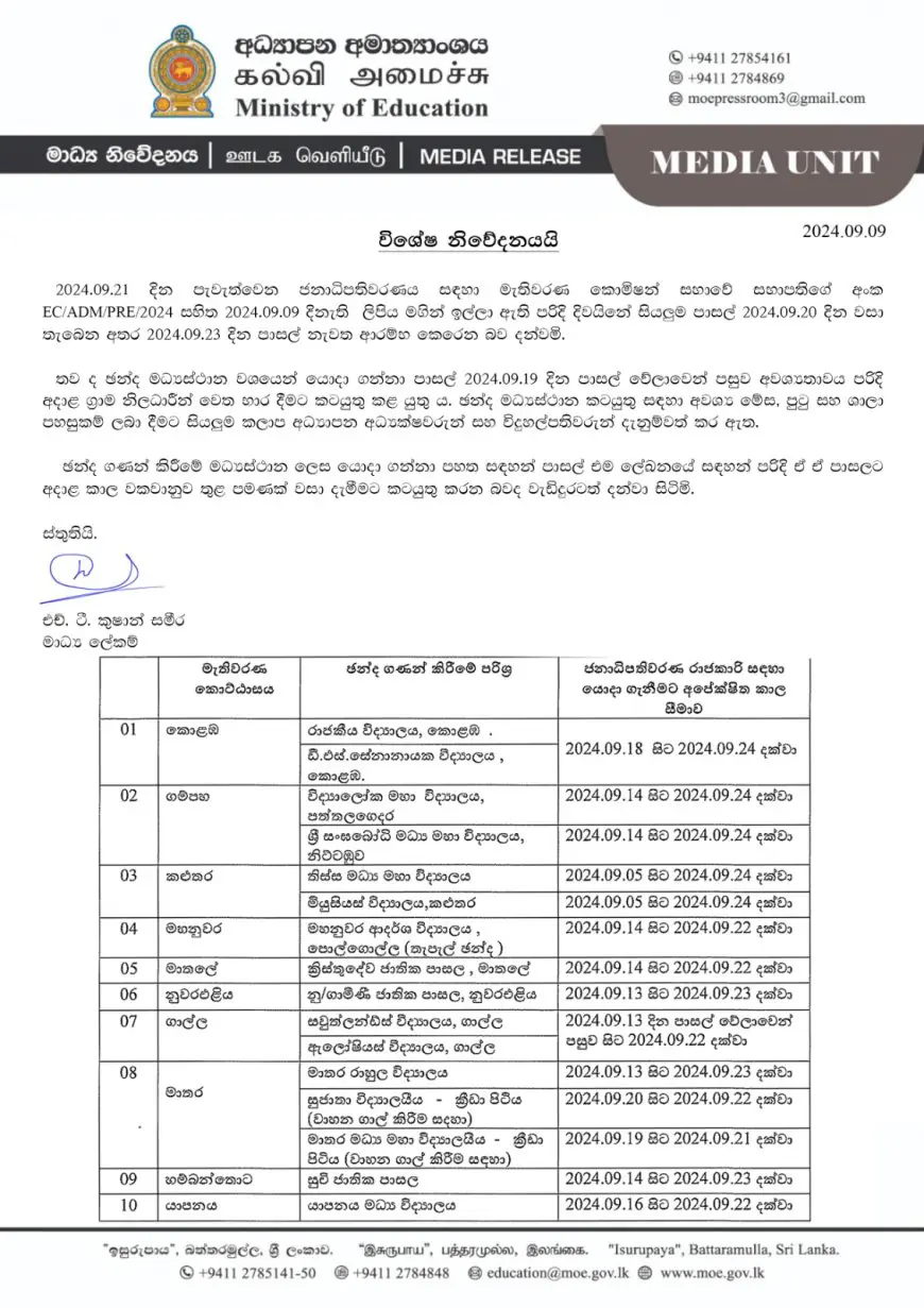 அத்துடன், வாக்குப்பதிவு மற்றும் வாக்கு எண்ணும் மையங்களாகப் பயன்படுத்தப்படும் பாடசாலைகள் செப்டம்பர் 18 முதல் 24 வரை மூடப்படும் என அறிவிக்கப்படும்.