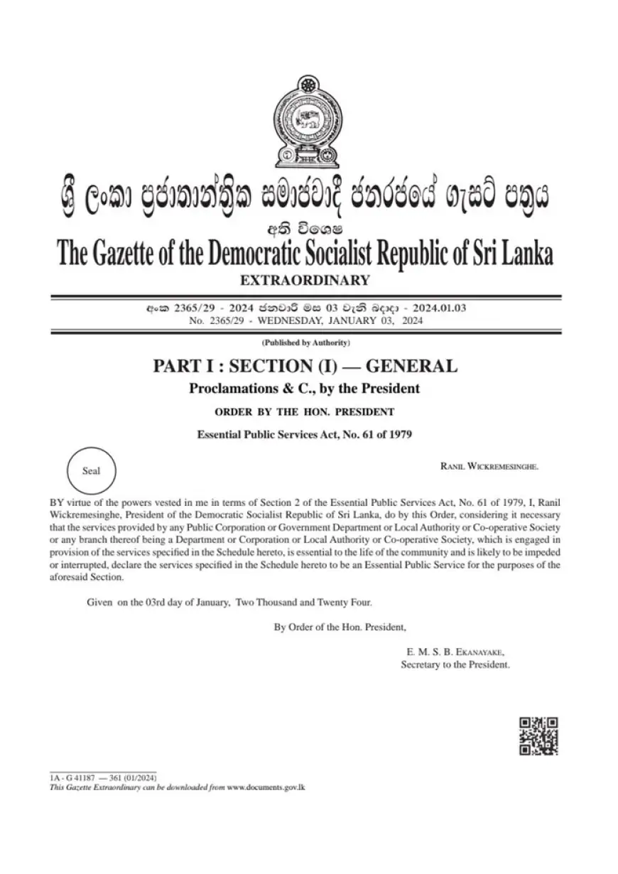 அத்தியாவசிய சேவை தொடர்பில் அதிவிசேட வர்த்தமானி வெளியானது