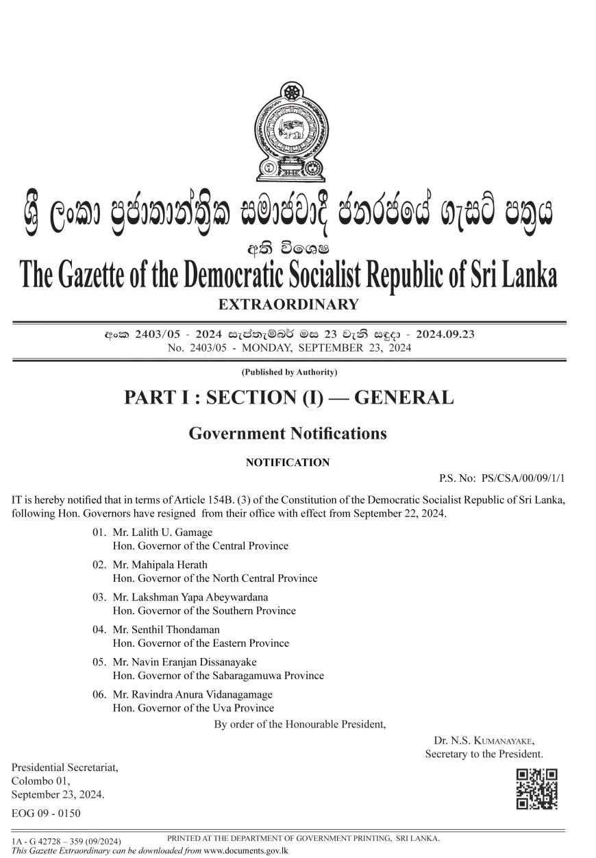 2024 ஜனாதிபதித் தேர்தலில் தேசிய மக்கள் சக்தியின் தலைவர் அநுரகுமார திசாநாயக்க வெற்றிப்பெற்றதை தொடர்ந்து ஆளுநர்கள் தமது பதவிகளை இராஜினாமா செய்து வருகின்றனர்.