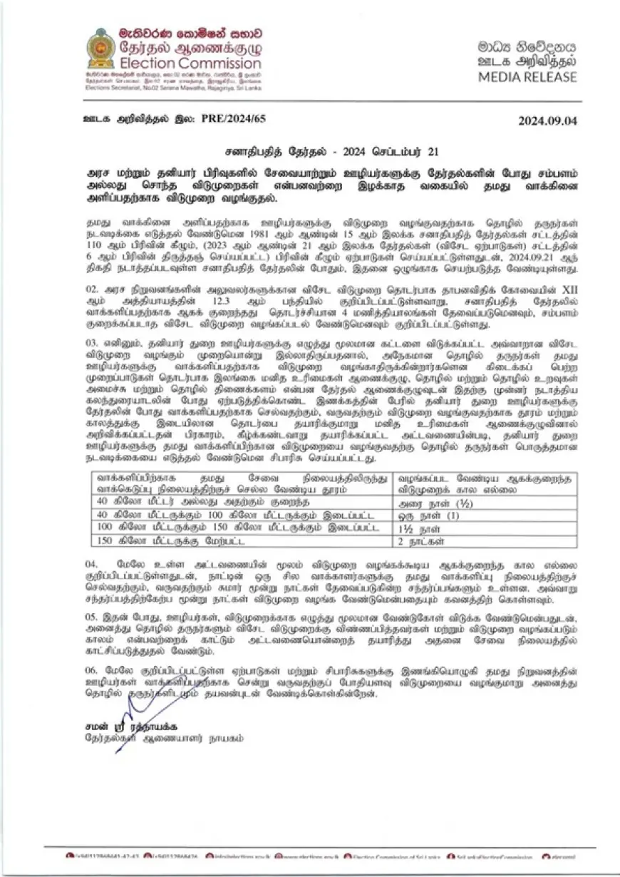 அதன்படி, 40 கிலோமீட்டருக்கு குறைந்த வாக்குச்சாவடி தூரம் இருக்கும் வாக்காளர்களுக்கு 1/2 நாள் விடுமுறையும் 150 கிலோமீட்டருக்கு மேற்பட்ட வாக்குச்சாவடி தூரம் இருக்கும் வாக்காளர்களுக்கு 2 நாட்கள் விடுமுறையும் வழங்கப்பட வேண்டும்.