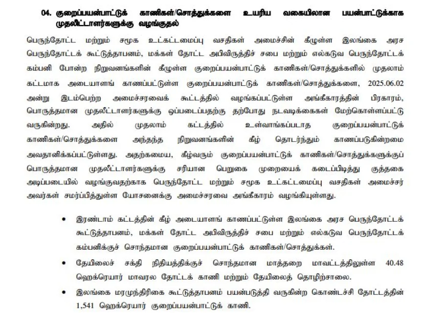 முதலீட்டாளர்களுக்காக தோட்ட நிலங்கள், சொத்துக்களை விடுவிக்க அமைச்சரவை அனுமதி