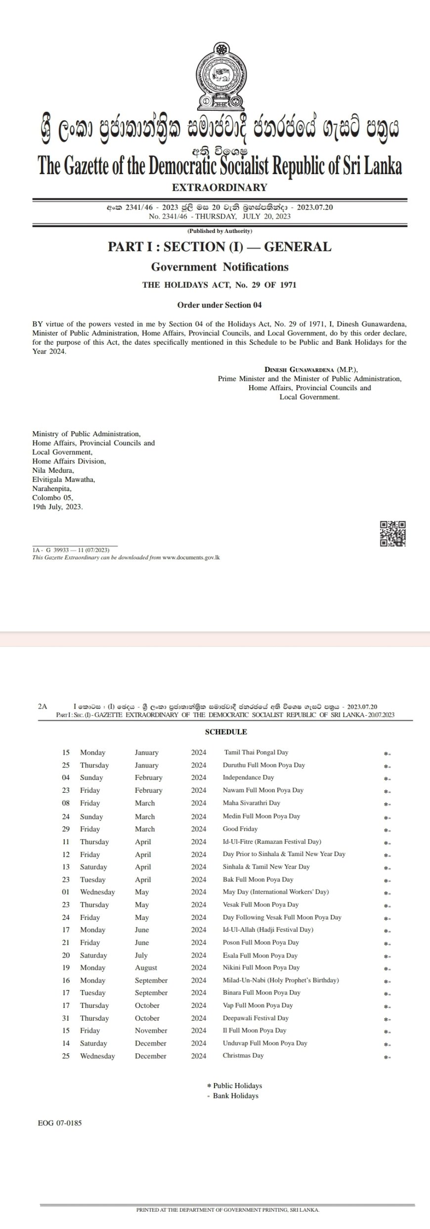 2024 ஆம் ஆண்டுக்கான பொது மற்றும் வங்கி விடுமுறை நாட்களை அறிவிக்கும் வர்த்தமானி அறிவிப்பு வெளியாகியுள்ளது.