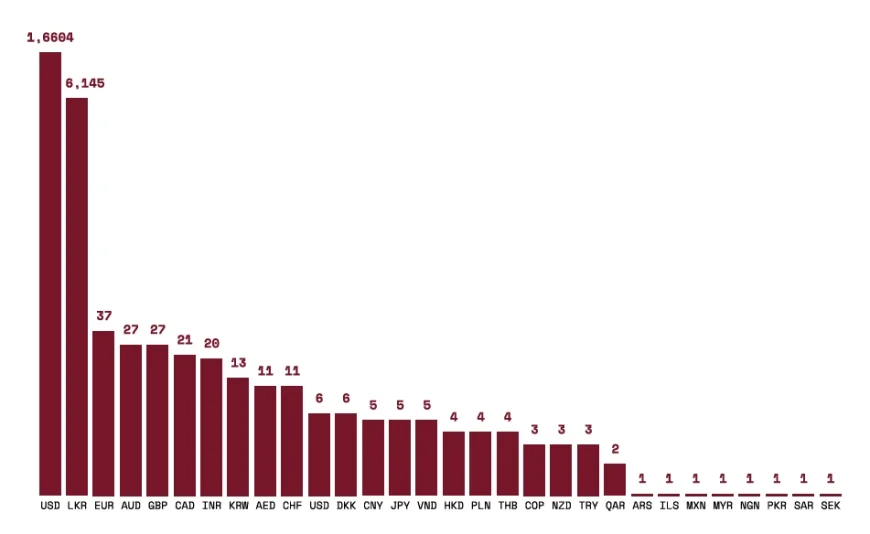 இந்த ஆய்வில் கண்டறியப்பட்ட நிதி தொடர்பான தகவல்கள் மேலும் பல கேள்விகளை எழுப்புகின்றன. தரவுத்தளத்திலுள்ள அரசியல் விளம்பரங்களுக்காக 30 வௌ;வேறு நாணயங்களில் பணம் செலுத்தப்பட்டுள்ளது. இதில் முதன்மையான நாணயமாக அமெரிக்க டொலர் இருந்தது. மொத்த விளம்பரங்களில் 72 சதவீதத்திற்கும் அதிகமானவற்றுக்கு (16,694 விளம்பரங்கள்) அமெரிக்க டொலர் பயன்படுத்தப்பட்டுள்ளது. இலங்கை ரூபாயானது 6,145 விளம்பரங்களுக்கு மட்டுமே பயன்படுத்தப்பட்டுள்ளது.