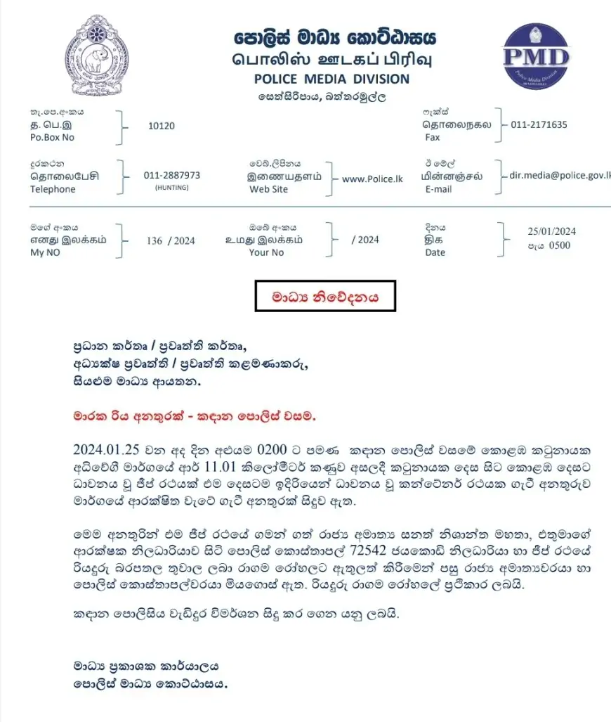 விபத்தில் கடும் காயங்களுக்குள்ளான இராஜாங்க அமைச்சர், அவரது பாதுகாப்பு உத்தியோகத்தர் மற்றும் வாகன சாரதி ஆகியோர் ராகம வைத்தியசாலையில் அனுமதிக்கப்பட்டனர்.