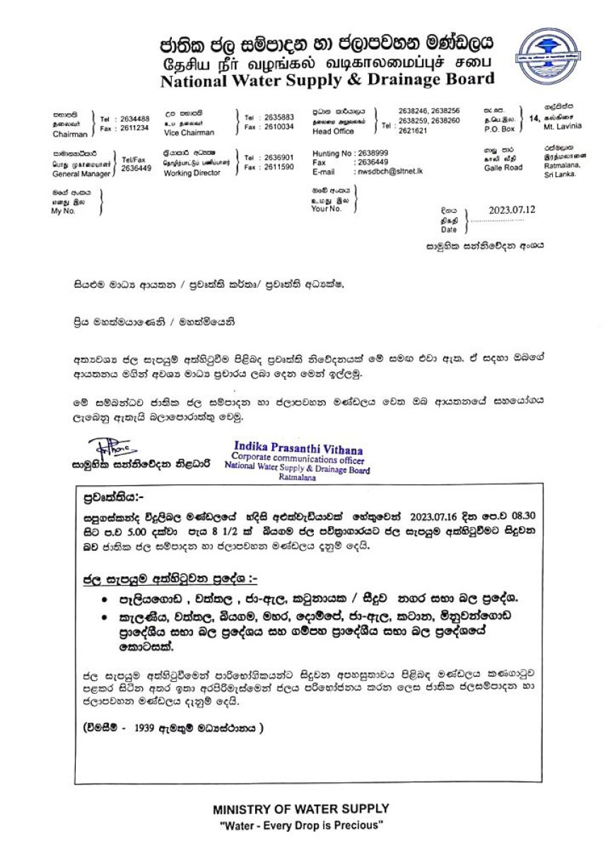 இதனால் பாவனையாளர்களுக்கு ஏற்படும் அசெளகரியங்களுக்கு தேசிய நீர் வழங்கல் வடிகாலமைப்பு சபை கவலை தெரிவிப்பதோடு, நீரை முன்கூட்டியே சேமித்து வைத்து சிக்கனமாக பயன்படுத்துமாறு கேட்டுக்கொண்டுள்ளது.