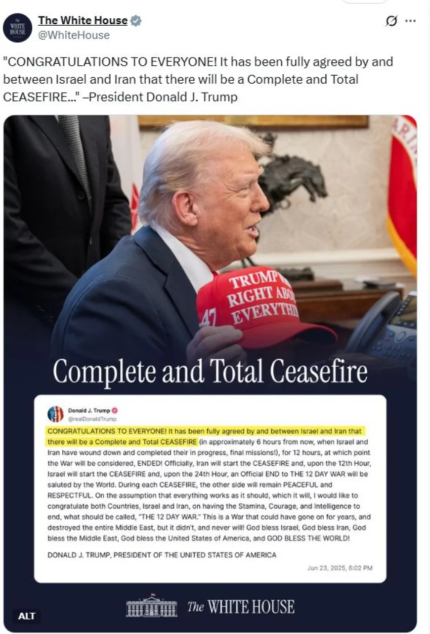 இது குறித்து தனது எக்ஸ் பக்கத்தில் பதிவிட்டுள்ளது டிரம்ப், அனைவருக்கும் எனது மனமார்ந்த வாழ்த்துக்கள். இஸ்ரேலும், ஈரானும் போர் நிறுத்தத்துக்கு முழுமையாக ஒப்புக்கொண்டன. இரு நாடுகளும் ராணுவ நடவடிக்கைகள் முடிந்தவுடன் சுமார் ஆறு மணி நேரத்தில் ஈரான் போர் நிறுத்தத்தை தொடங்கும்.