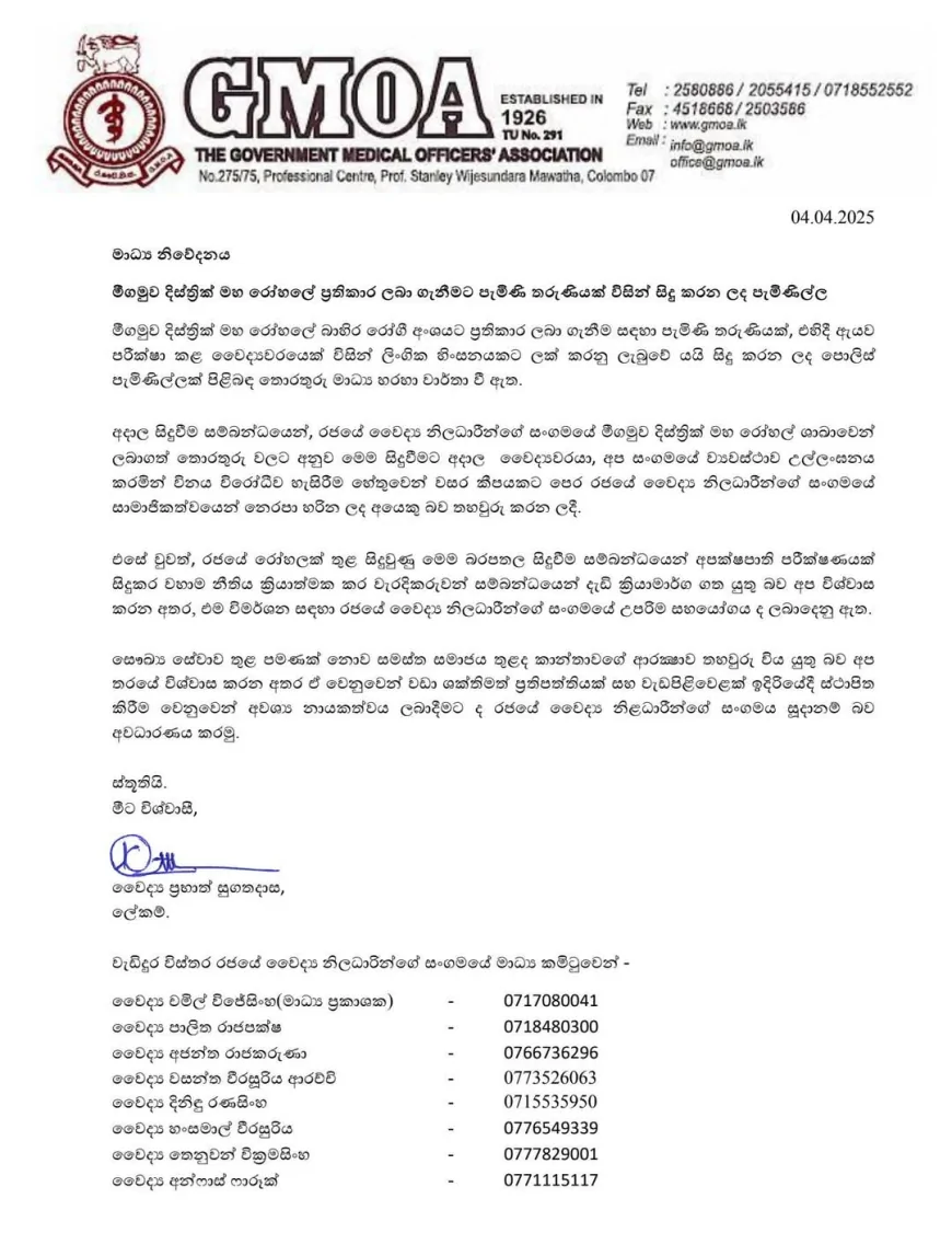 இது தொடர்பில் அரசாங்க வைத்திய அதிகாரிகள் சங்கத்தின் ஊடகப் பேச்சாளர் டொக்டர் சம்மில் விஜேசிங்கவிடம் கேட்ட போது, குற்றம் சுமத்தப்பட்ட வைத்தியர் தமது சங்கத்தின் உறுப்புரிமையிலிருந்து நீக்கப்பட்டதாக தெரிவித்தார்.
